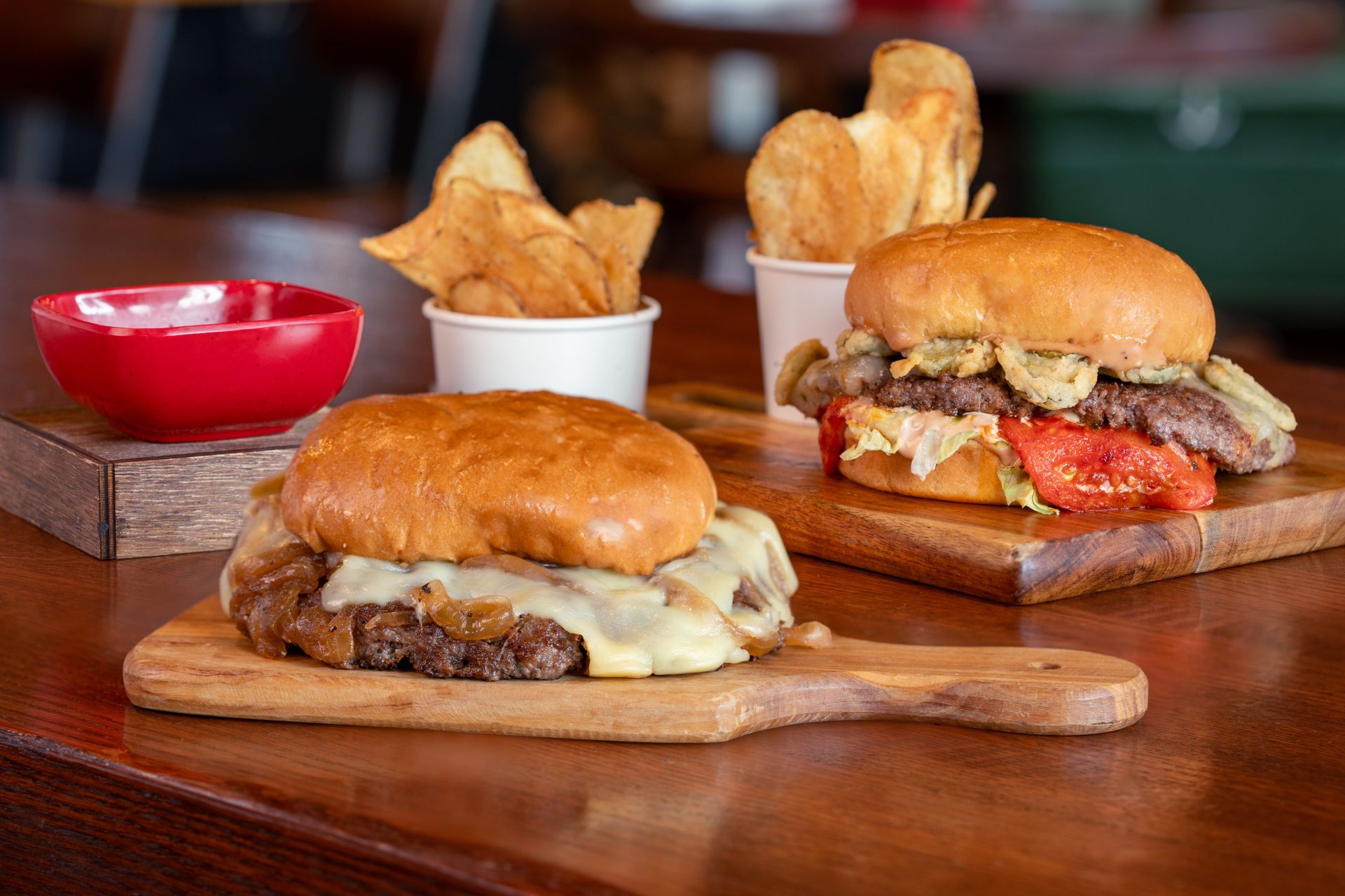 Drake’s butcher blend patty with gruyere cheese & caramelized onions on a warm butter-toasted bun with herb au jus; served with chips.