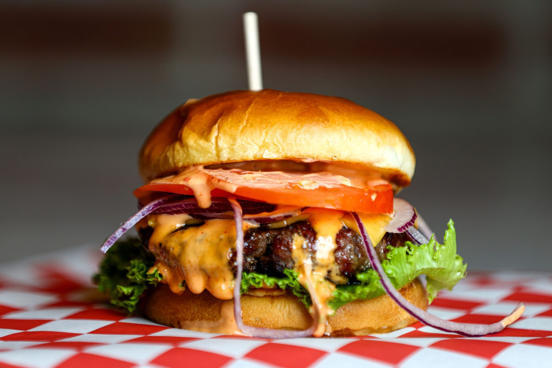$8 Indy Burger Traditional burger with our proprietary Black Angus blend of brisket, short rib & sirloin. Cooked over our Wood-Fired Grill, topped with American Cheese, Tomato, Onion, Lettuce and our house-made Flamme Sauce!